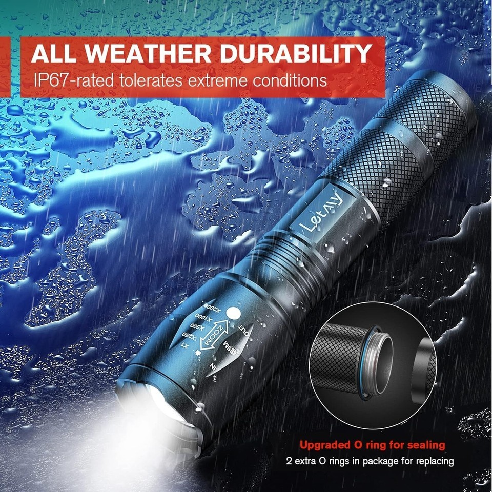 ?WATERPROOF HIGH QUALITY FLASHLIGHTS?LETMY flash light can waterproof from splashing water from any angle and heatproof. Suitable for the outdoor environment and adverse weather conditions. The body of this flashlight is made of high quality military grade aluminum alloy. This LED flashlight is sturdy and durable enough for long time daily using.