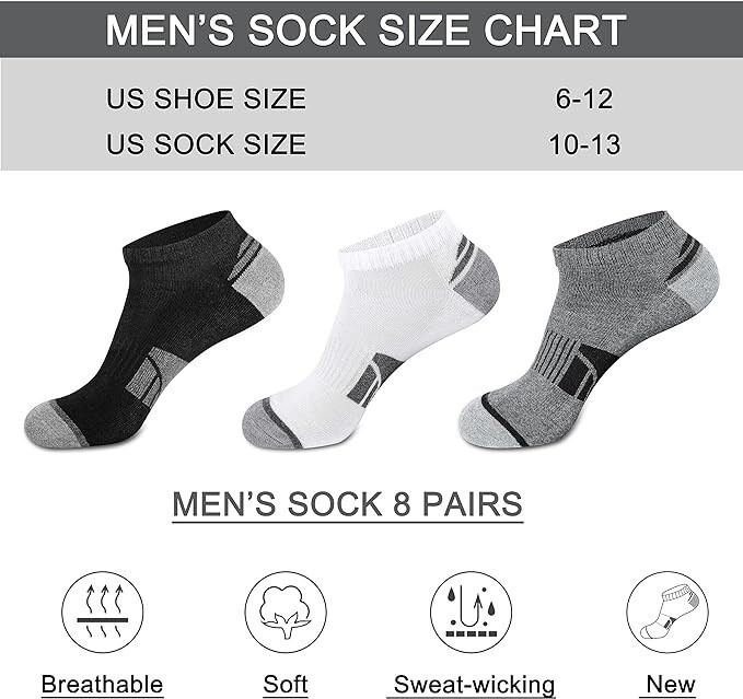 Socks Size - Fits for US men sock size 10-13 (shoe size 6-12). Package: 8 pairs of mens low cut socks.