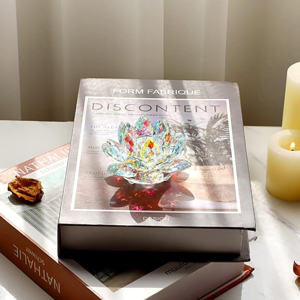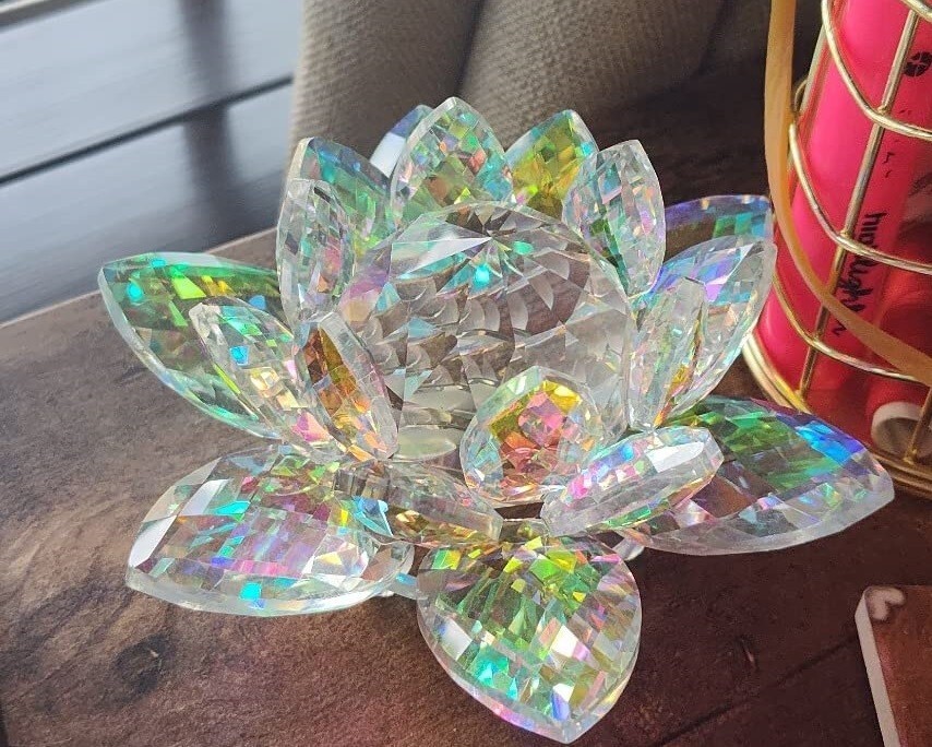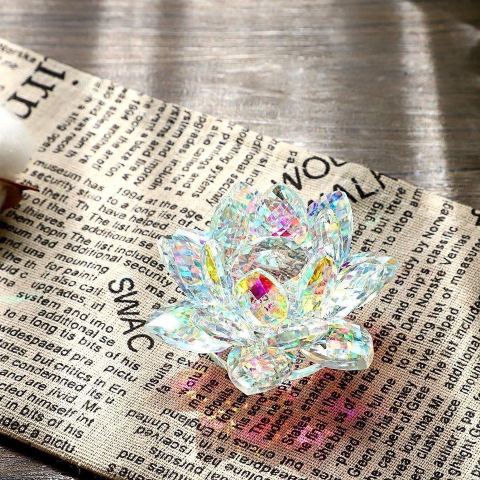 Made of colorful crystal material, this sparkly lotus figurine is durable and dust-proof, each lotus petal will glitter like diamond and catch / reflect sunlight when illuminating it directly. (AB color crystal material will reflect different color under light!)