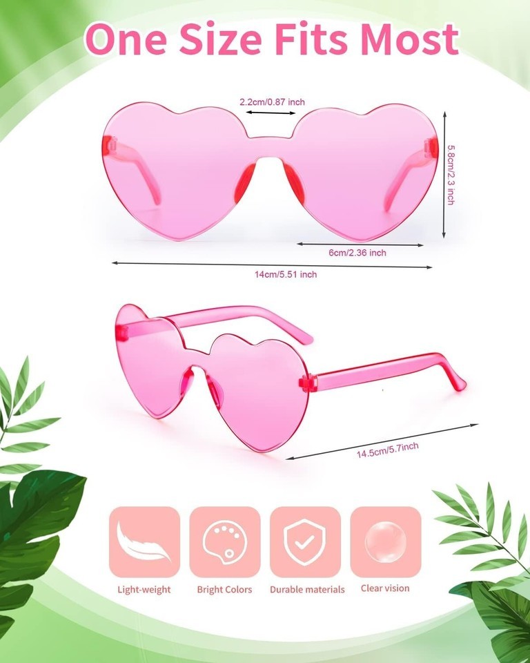 ??One size fits most?lens width: 60 mm/ 2.36 inch; Lens height: 58 mm/ 2.3 inches.Rimless heart sunglasses are sized for most men, women and teenagers and fit most face shapes.Transparent heart sunglasses for women are lightweight and won't burden you with anything!