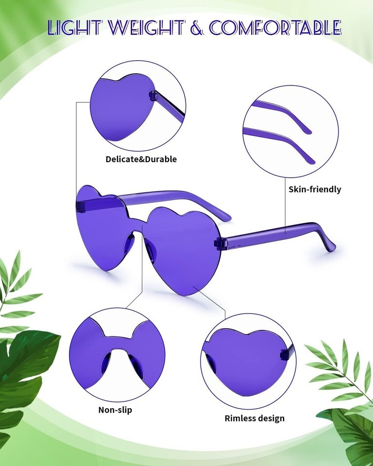 ??Durable colorfast?Heart shaped sunglasses made of high quality plastic material, appropriate elasticity makes heart glasses easy to put on and take off, not easy to deform and damage, not easy to fade.