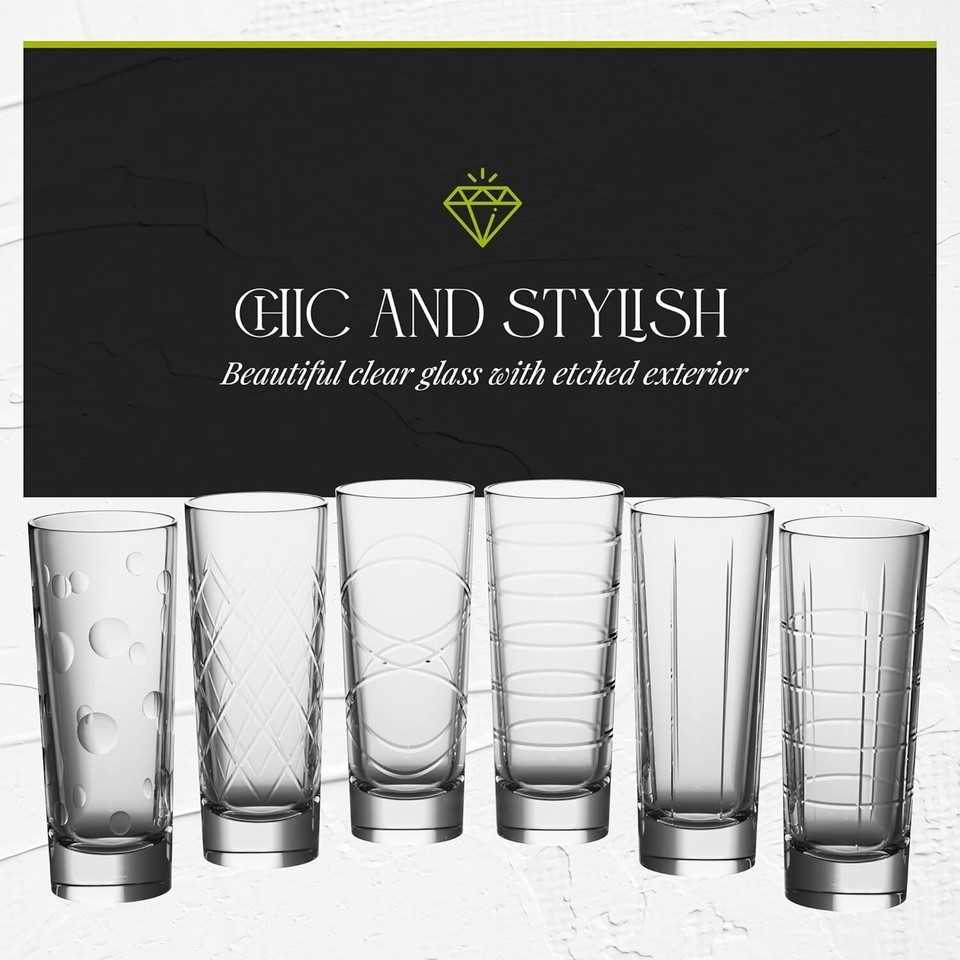 Each glass is etched with a different design, so drinks never mix up. Whimsical patterns of dots, lines and swirls coordinate each other for a playful feel.