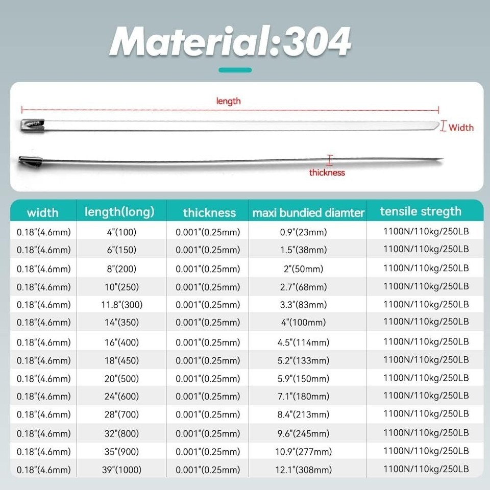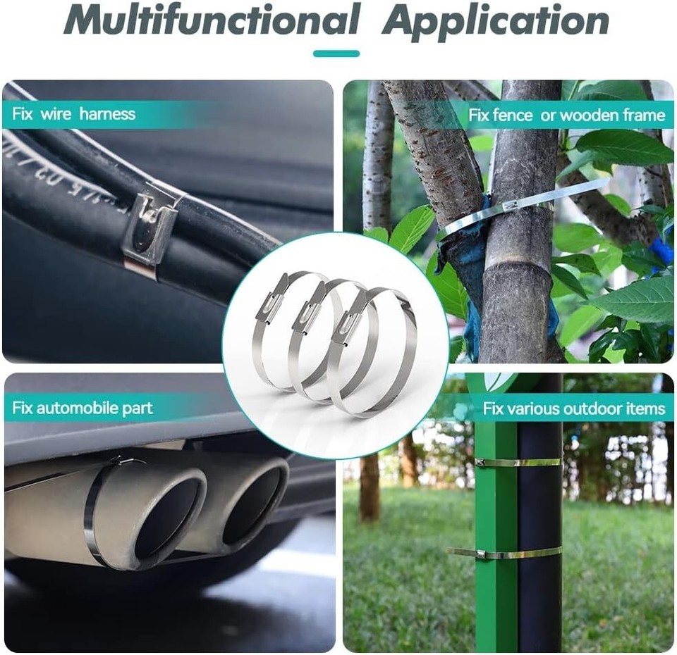 ?characteristic?: Used For Automotive Application Such As computer, ship cable, Exhaust Heat Wrap Binding, fence Repair, Etc.Don't Worry About Heat And Corrosion. Perfect For Outdoor Applications.Outstanding chemical resistance, Antimagnetic, Non-burning, Easy fitting Anti-corrosive.No Special Tools Required. just Need A Needle Nose Plier To Tighten And A Diagonal Plier Or Tin Snips To Cut it