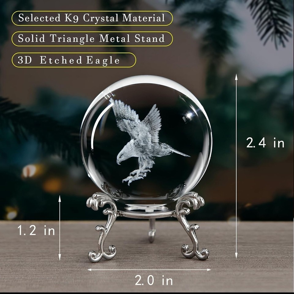 Unique piece: 3D laser etched eagle crystal ball with solid metal stand,meticulously crafted by our skilled craftsman, ensuring that each piece is a unique work of art. Size: 2.4 in(60mm)