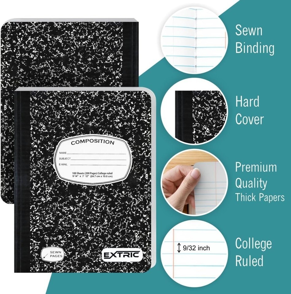 College ruled composition notebooks - each composition book includes 100 sheets (200 pages) of thick premium quality paper, 9 3/4 inch X 7 1/4 inch this notebook is perfect for taking notes or any other information that you don't want to forget.
