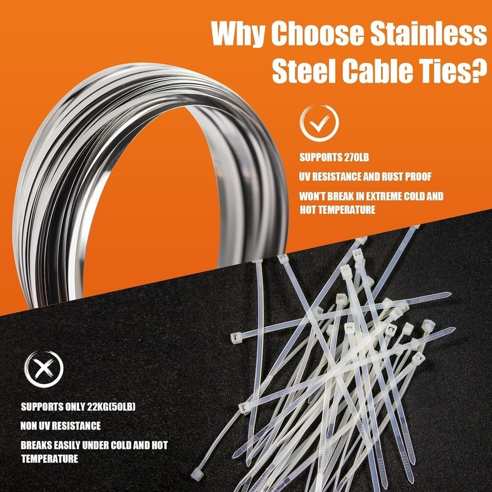 [Versatile Applications] With their impressive strength and flexibility, our stainless steel zip ties have a wide range of applications. From organizing cables in your home theater system to securing fencing in your garden, these zip ties excel in any situation. They are also ideal for bundling and fastening items during camping trips or outdoor adventures.