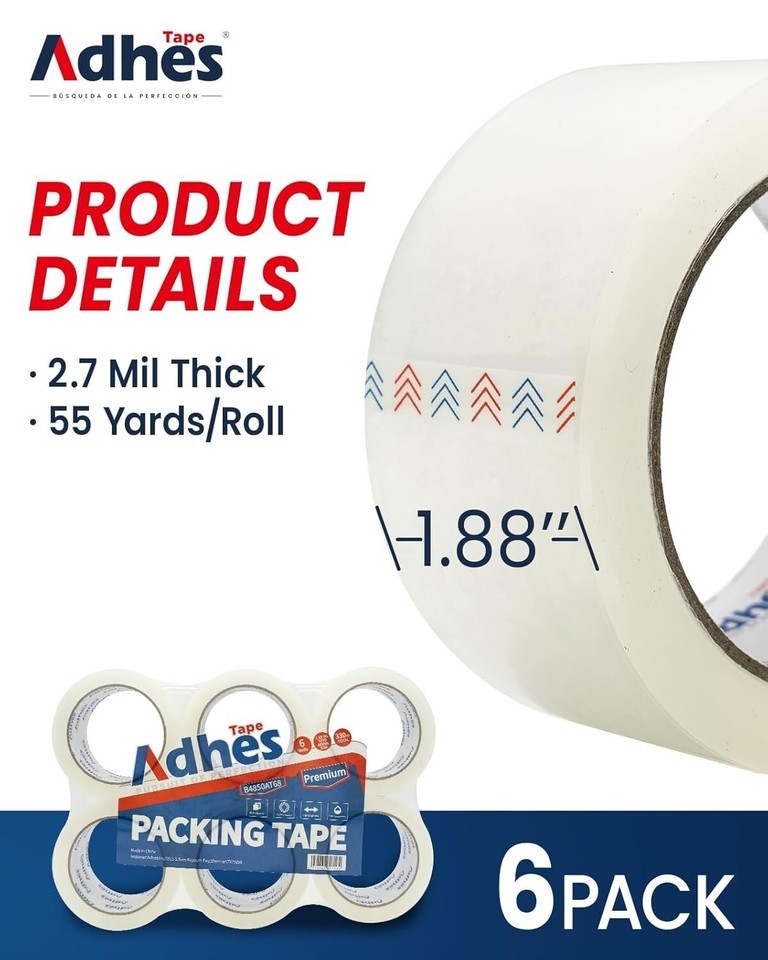 ADHES Heavy Duty Packing Tape, 6 Rolls, 1.88 Inch x 55 Yards, 2.7 mil Clear Ship