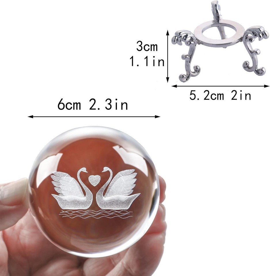 Specification - Diameter:2.3in./60mm;NW:325g.It is equipped with a silver metal stand.This lifelike swan is carved in our crystal ball by advanced laser engraving technology.It is Optically Clear making it seems vivid and realistic.It is highly durable,swans will not fade,rub off.It is a special decoration of table.