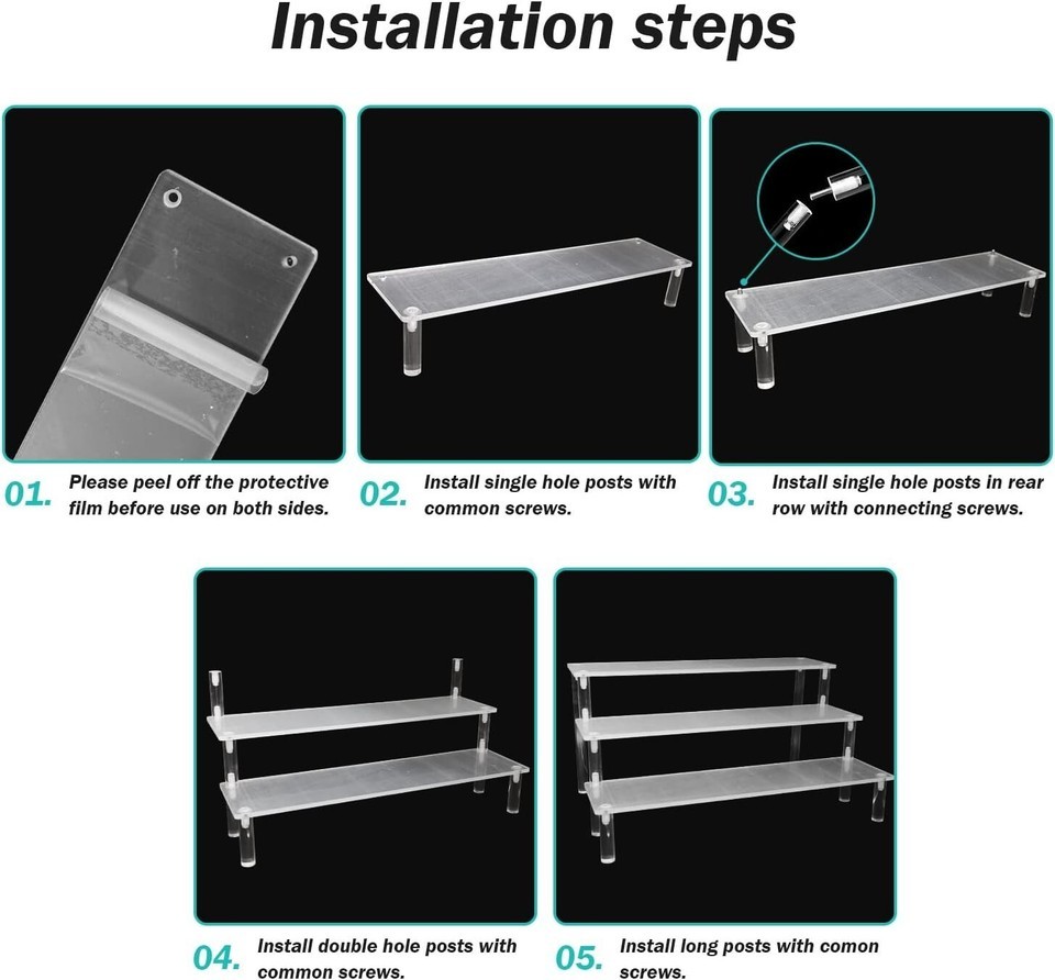 ?Easy to install?Please tear off the protective film from the plate before installation! Use a screwdriver to install the acrylic risers in order to get a clear display stand.Doesn't take up space when not in use.