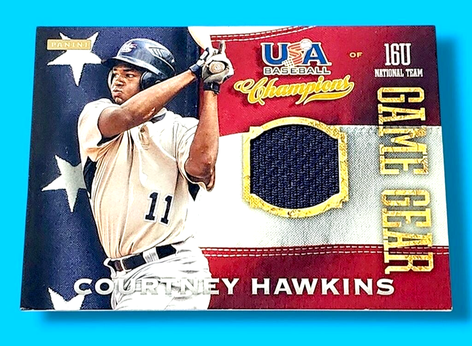 Discover a piece of baseball history with the Courtney Hawkins 2013 Panini USA Baseball Champions Game Gear Relic Card. This collectible card features a unique relic from the jersey of Courtney Hawkins, a notable player from the 2013 Major League Baseball season. The card is part of the sought-after 2013 Panini USA Baseball Champions set, showcasing the excellence of American baseball talent.