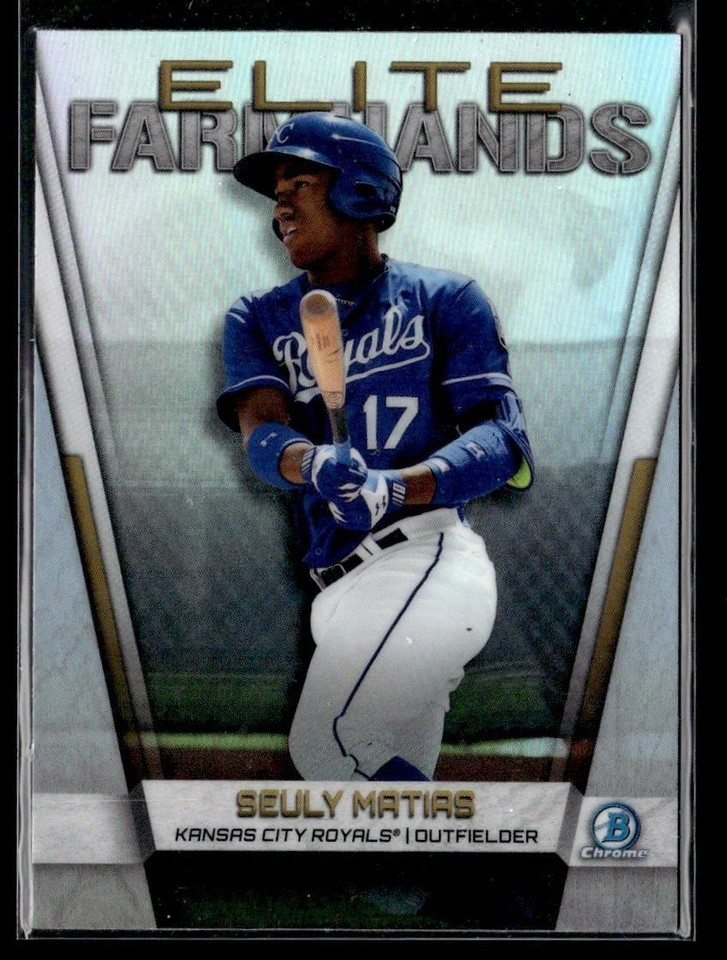 The product is a 2019 Bowman Chrome Elite Farmhands trading card featuring MLB player Seuly Matias from the Kansas City Royals. This original card is part of the Elite Farmhands insert set and is a valuable collectible for baseball fans and card enthusiasts. With its unique design and connection to a promising player, this card offers a glimpse into the talent and potential of the sport's future stars.