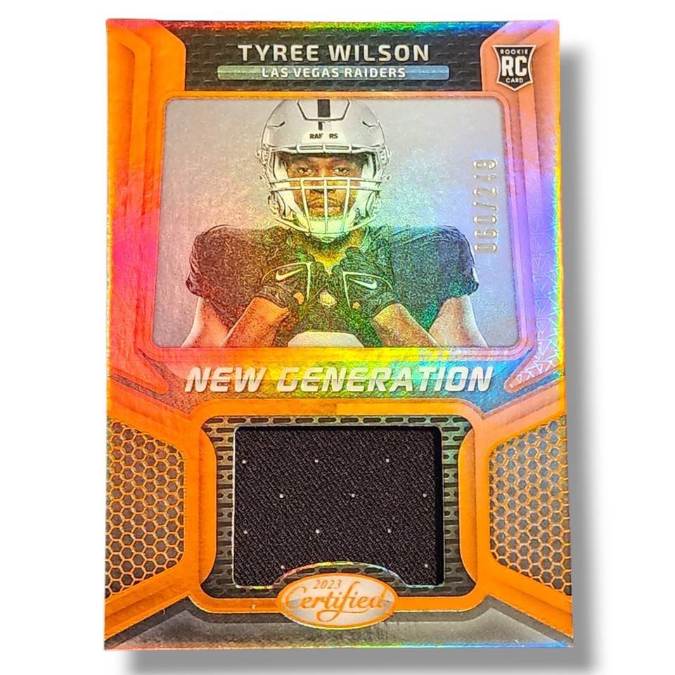 Enhance your sports card collection with the 2023 Certified Tyree Wilson "New Generation" Orange Rookie Jersey RC SP. This limited edition card, numbered to just 249, captures the essence of the promising Las Vegas Raiders player. The orange parallel variety adds a vibrant touch to the memorabilia, making it a standout piece.