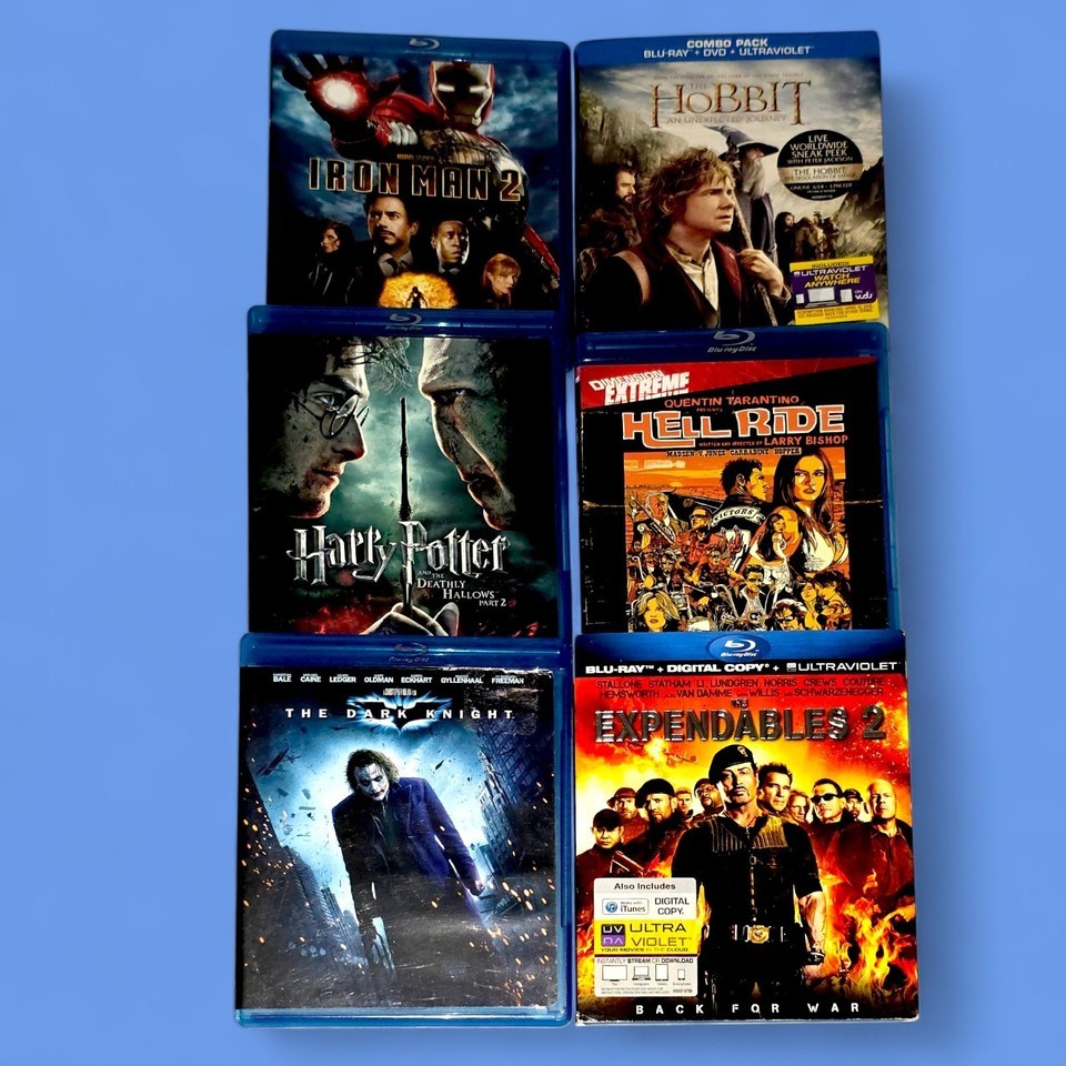 You will receive all blu-rays pictured The dark Knight, Harry Potter and the deathly hallow part 2, iron Man 2, The Expendables 2, Hell Ride and Hobbit an unexpected journey.