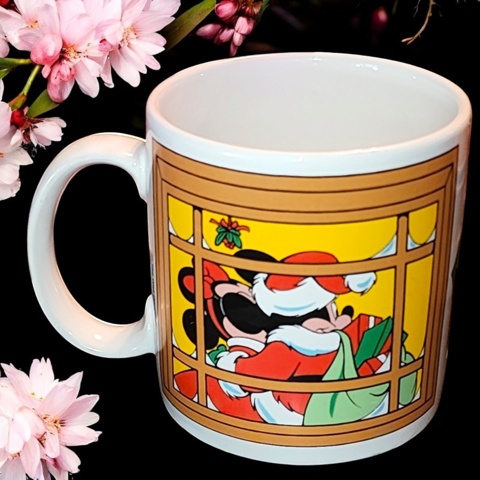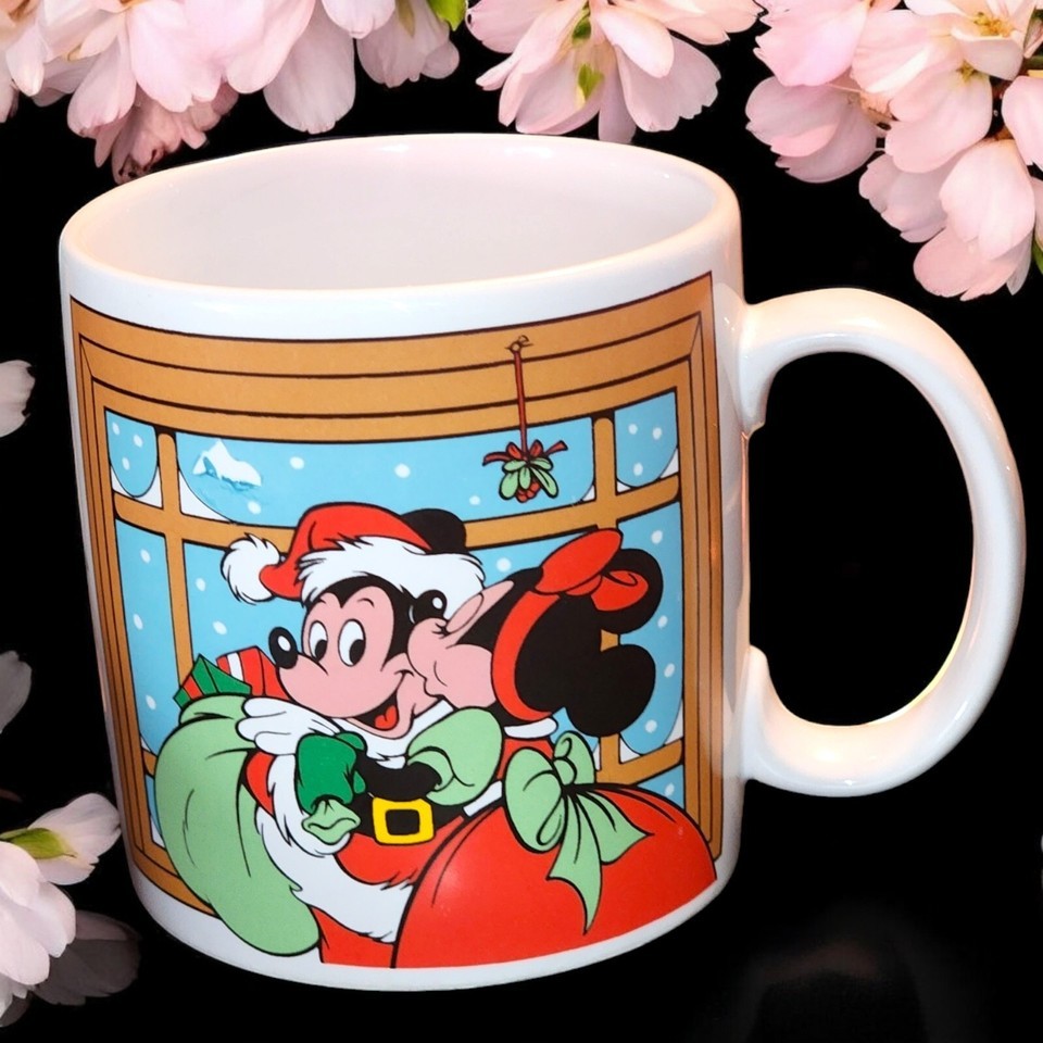 Celebrate the holiday season with a touch of Disney magic. This charming 12 oz mug features the iconic Mickey and Minnie Mouse, adorned with festive holly and mistletoe, perfect for adding a dash of cheer to your winter mornings or evening cocoa. Manufactured in Korea in 1988, this piece is a delightful nod to classic Disney holiday memorabilia.