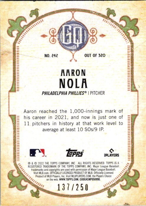 2022 Topps Gypsy Queen - Indigo #242 Aaron Nola /250