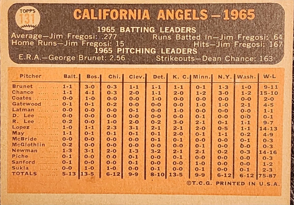 Vintage California Angels 7th Place American League 1965 Topps Baseball Card 131