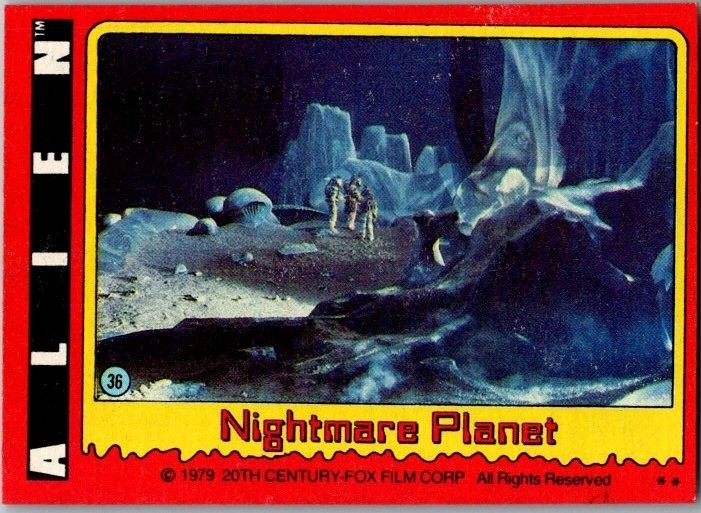 The product is a 1979 Topps Alien Nightmare Planet #36 trading card, featuring the movie "Aliens." This non-sport trading card is from the 1979 Topps Alien set and is written in English. It is a vintage collectible item that would be sought after by fans of the Alien franchise and collectors of vintage trading cards. This particular card showcases "Nightmare Planet" as the player/athlete, offering a nostalgic glimpse into the world of sci-fi and horror films from the late 1970s.
