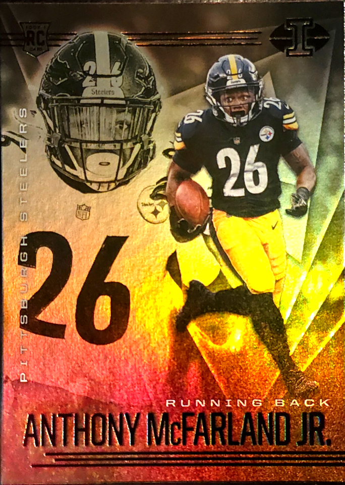 The 2020 Panini Illusions Football #42 Anthony McFarland Jr. Rookie Card is a standard-sized trading card featuring the Pittsburgh Steelers player from the National Football League (NFL). This original card, manufactured by Panini, is made of card stock and is a part of the 2020 Panini Illusions set. As a rookie card, it holds value for collectors looking to add a piece of the player's early career to their collection. The card showcases Anthony McFarland Jr. in his rookie season, making it a desirable item for fans and sports memorabilia enthusiasts.