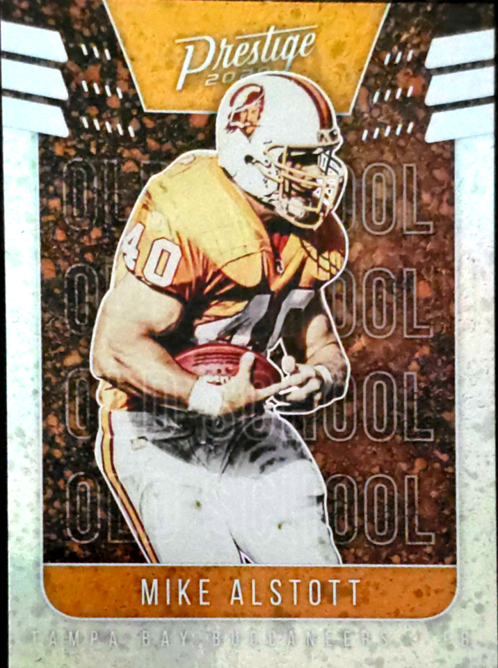 The product is a 2020 Panini Prestige Mike Alstott Old School Tampa Bay Buccaneers trading card. This card features the former NFL player Mike Alstott from the Tampa Bay Buccaneers, part of the 2020 Panini Prestige set. Made of card stock, this original insert card is designed in English and manufactured by Panini in the United States. It is a standard-sized sports trading card that pays homage to the Old School era of football, making it a unique and collectible item for fans of both the player and the team.