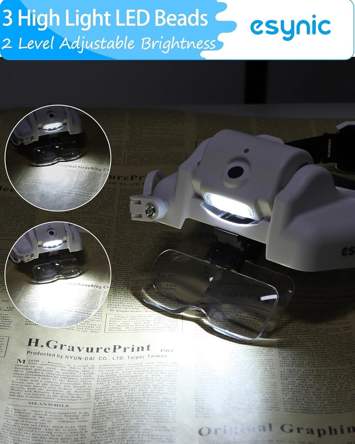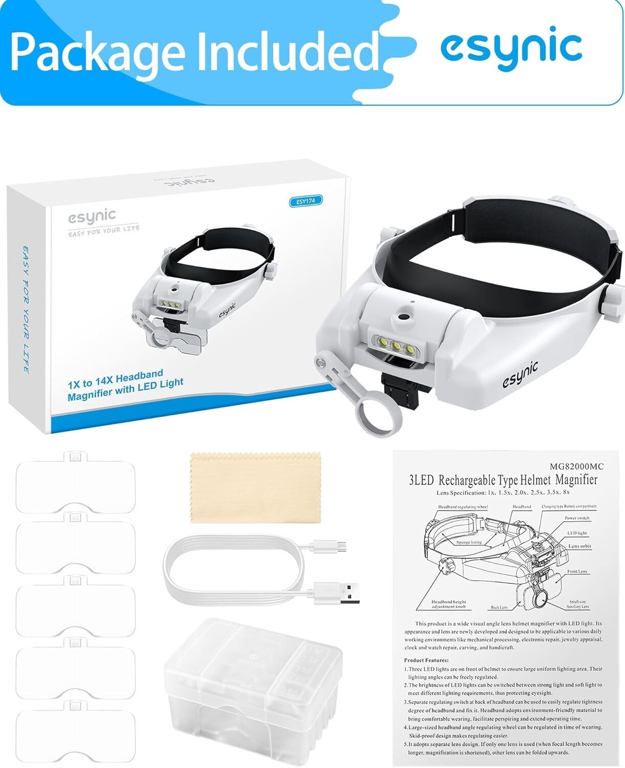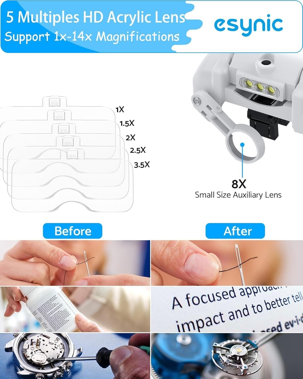 Discover the eSynic Head Mount Magnifying Glasses with Light, your perfect tool for detailed work. Featuring an adjustable headband with a quick-tighten switch and no nose support for maximum comfort. Equipped with five detachable lenses (1.0x to 3.5x) and an 8-fold lens, it adapts to various tasks by combining different magnifications. Two adjustable lighting levels ensure optimal illumination for every need. The rechargeable battery provides 8-12 hours of use and can be easily removed for charging without interrupting your work. Ideal for mechanical, electronic, jewelry, clock maintenance, and crafting tasks, this magnifier is designed to make your work easier and more precise. Trust in a brand with over 10 of experience committed to enhancing your visual clarity.