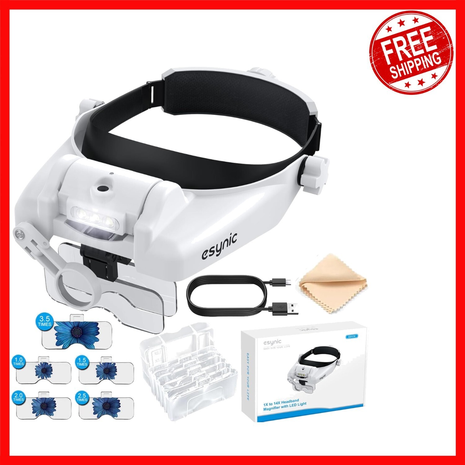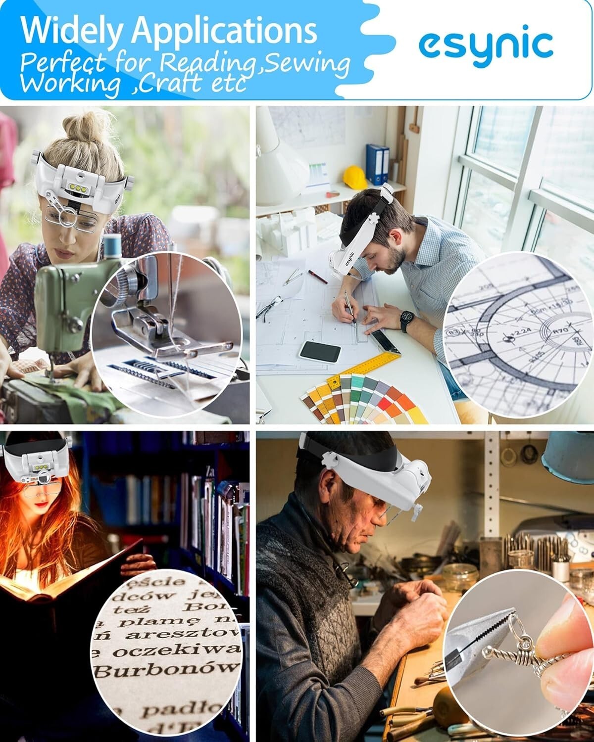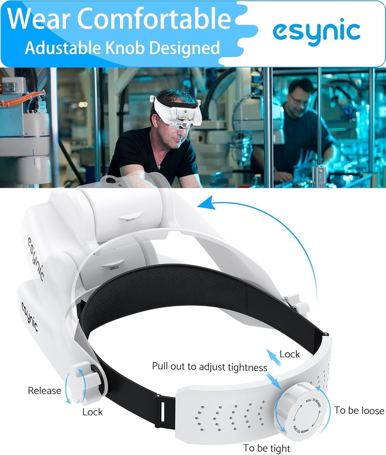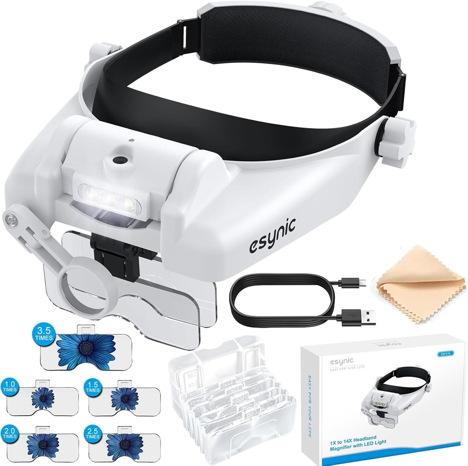 Discover the eSynic Head Mount Magnifying Glasses with Light, your perfect tool for detailed work. Featuring an adjustable headband with a quick-tighten switch and no nose support for maximum comfort. Equipped with five detachable lenses (1.0x to 3.5x) and an 8-fold lens, it adapts to various tasks by combining different magnifications. Two adjustable lighting levels ensure optimal illumination for every need. The rechargeable battery provides 8-12 hours of use and can be easily removed for charging without interrupting your work. Ideal for mechanical, electronic, jewelry, clock maintenance, and crafting tasks, this magnifier is designed to make your work easier and more precise. Trust in a brand with over 10 of experience committed to enhancing your visual clarity.