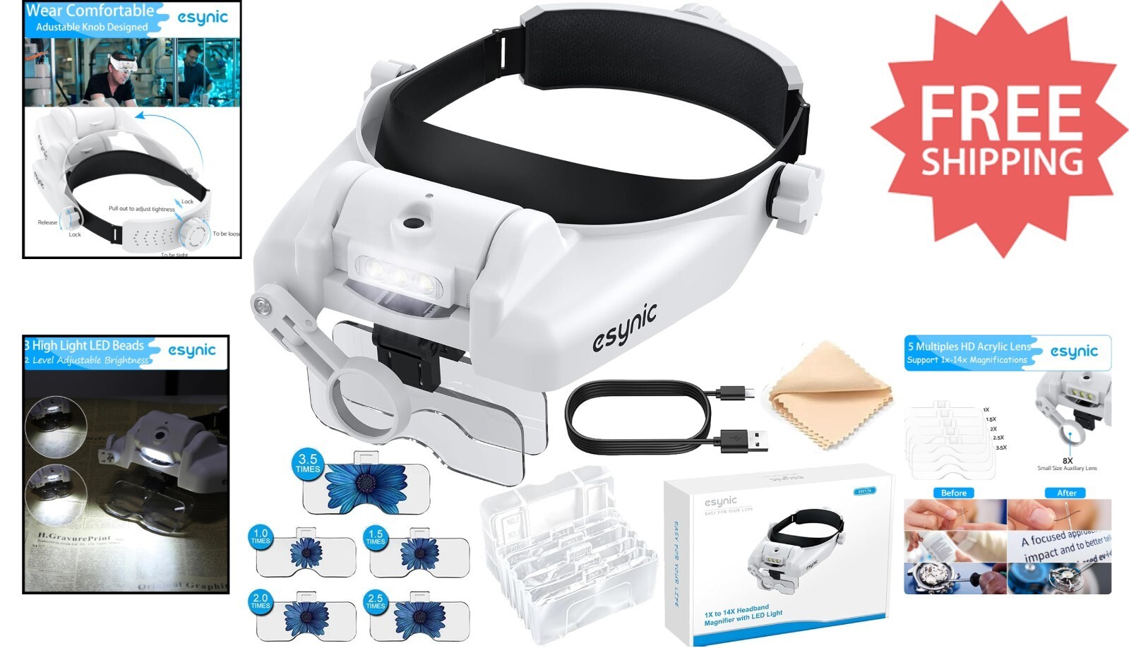 Features: USB,Rechargeable,Adjustable Switch,No Nose Support Design,5 Detachable Lenses,Rechargeable Battery,Hands-Free,Lightweight