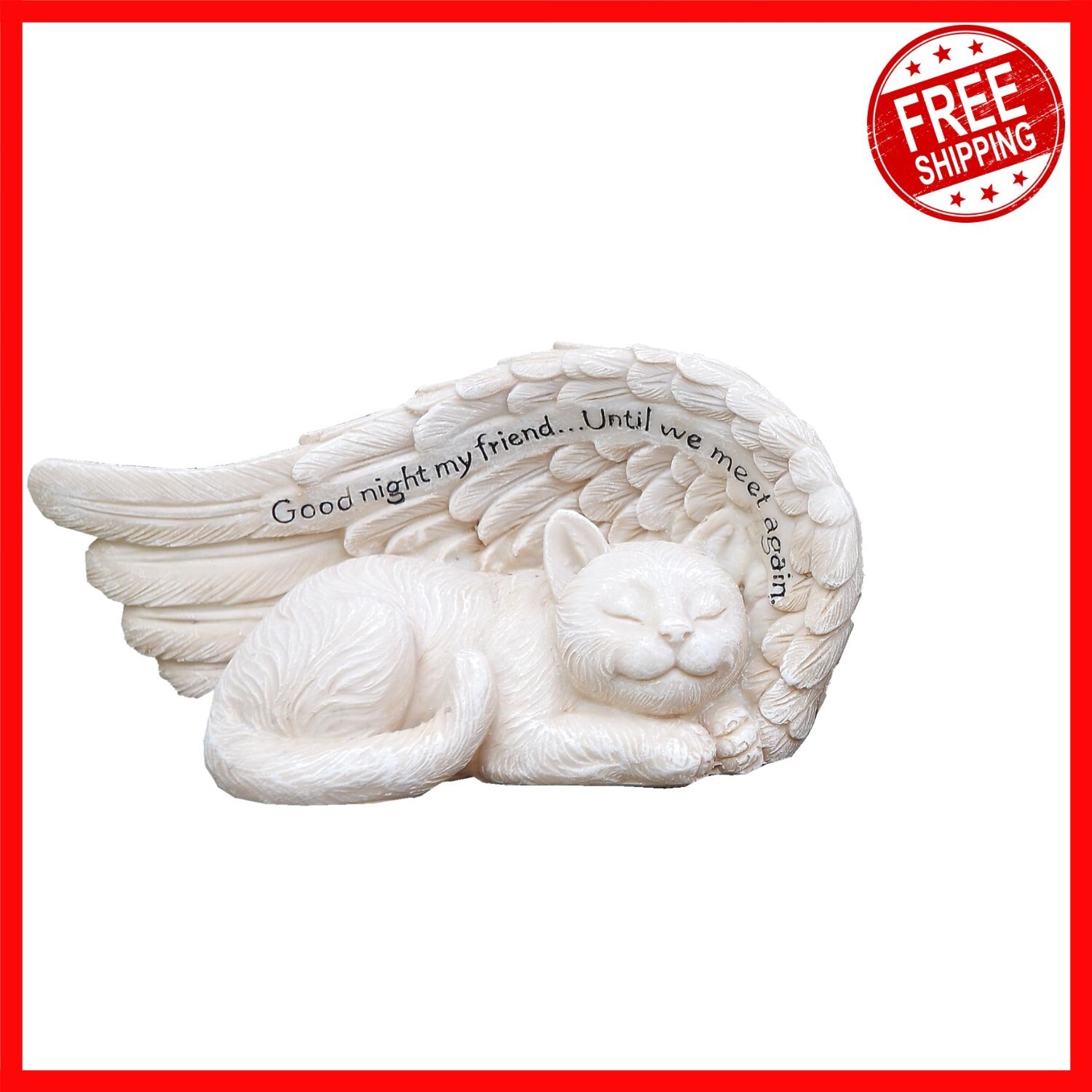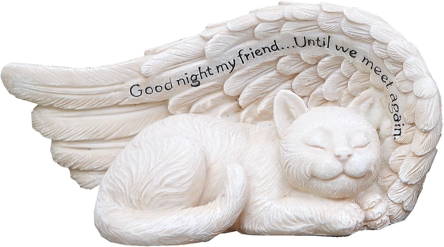 Honor the memory of a beloved pet with this touching memorial statue of a peacefully sleeping cat enveloped in an angel's wing. The inscribed message, "Goodnight My Friend, Until We Meet Again," offers comfort and remembrance. Crafted from durable resin, this 8 x 4-inch sculpture is suitable for both indoor and outdoor display. Designed with quality and care, it adds a heartfelt touch to any garden or home decor. Look to Napco for a wide selection of seasonal, garden, gift, and inspirational decor to enrich your living space.