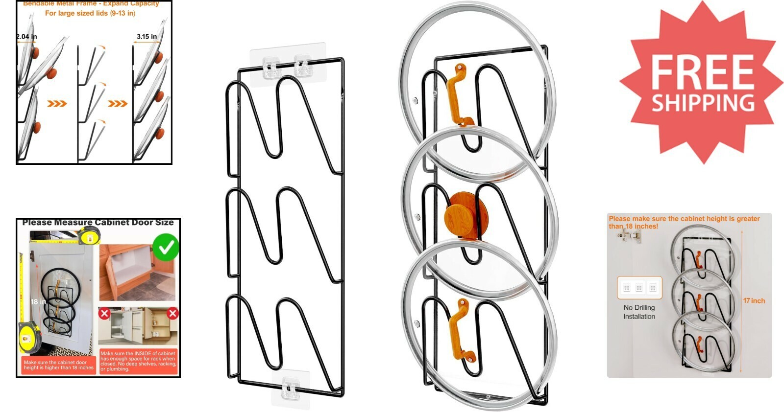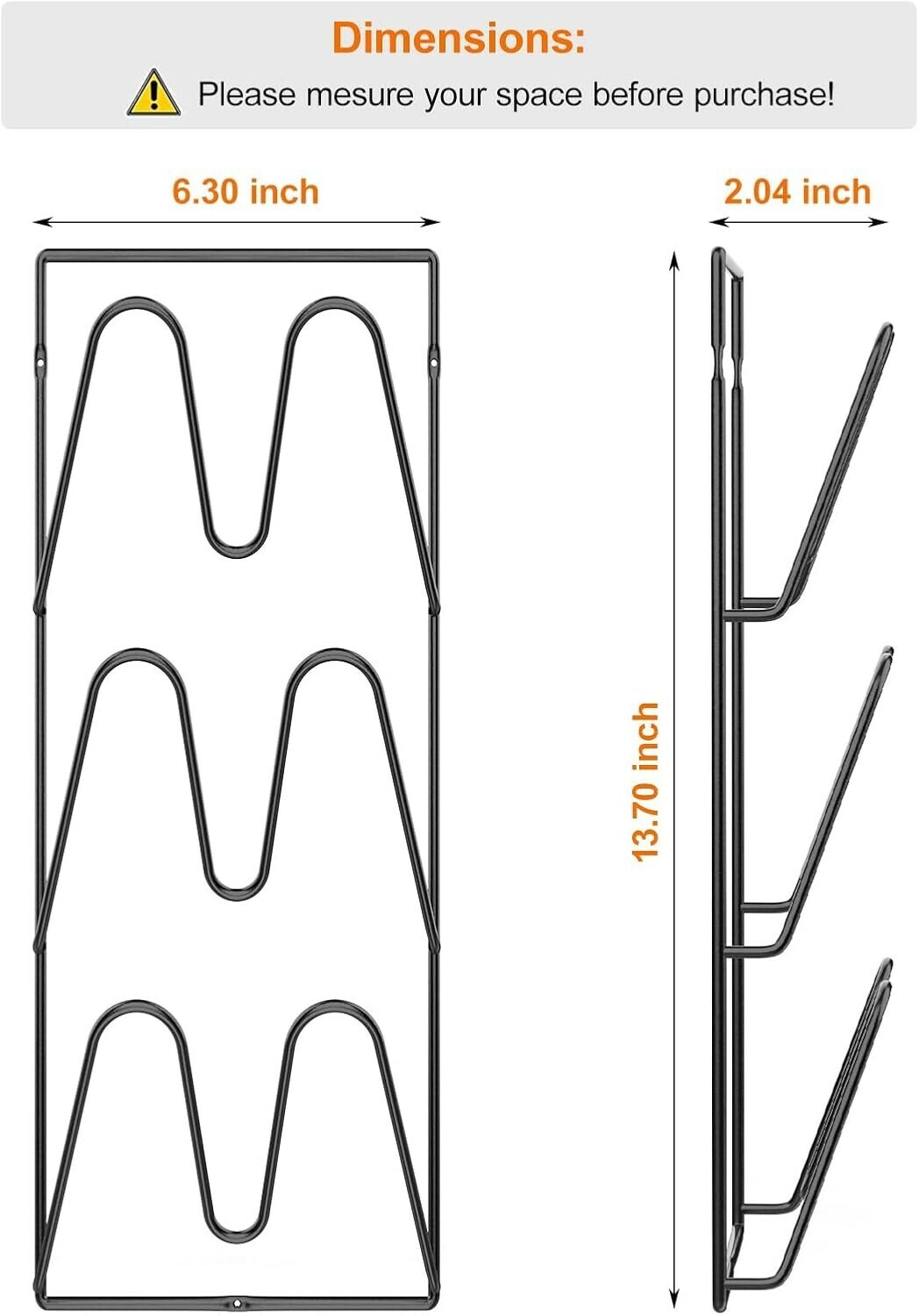 Maximize your kitchen space with the Durmmur 2-pack pot lid holders, designed with a 6-tier capacity to organize lids efficiently. Crafted from durable, rustproof materials with a sleek black finish, these racks feature a versatile U-slot handle design that accommodates various lid types securely. Flexible installation options include strong adhesive hooks suitable for smooth surfaces and hardware for rougher walls or cabinet doors. Please note the bendable rack should not be forced excessively to fit large pot lids to ensure proper closure of cabinet doors. Overall dimensions are 6.3 x 2.4 x 13.6 inches, making them a practical addition to any kitchen. Includes accessories for multiple installation methods. To ensure fast and reliable delivery, we work with multiple fulfillment partners and suppliers. Depending on availability and location, your order may ship from different warehouses or arrive in packaging that varies from item to item. Tracking details are typically provided shortly after shipment, and customer satisfaction remains our top priority. Please note that due to carrier policies and regional regulations, certain items may not be eligible for delivery to specific states or territories.