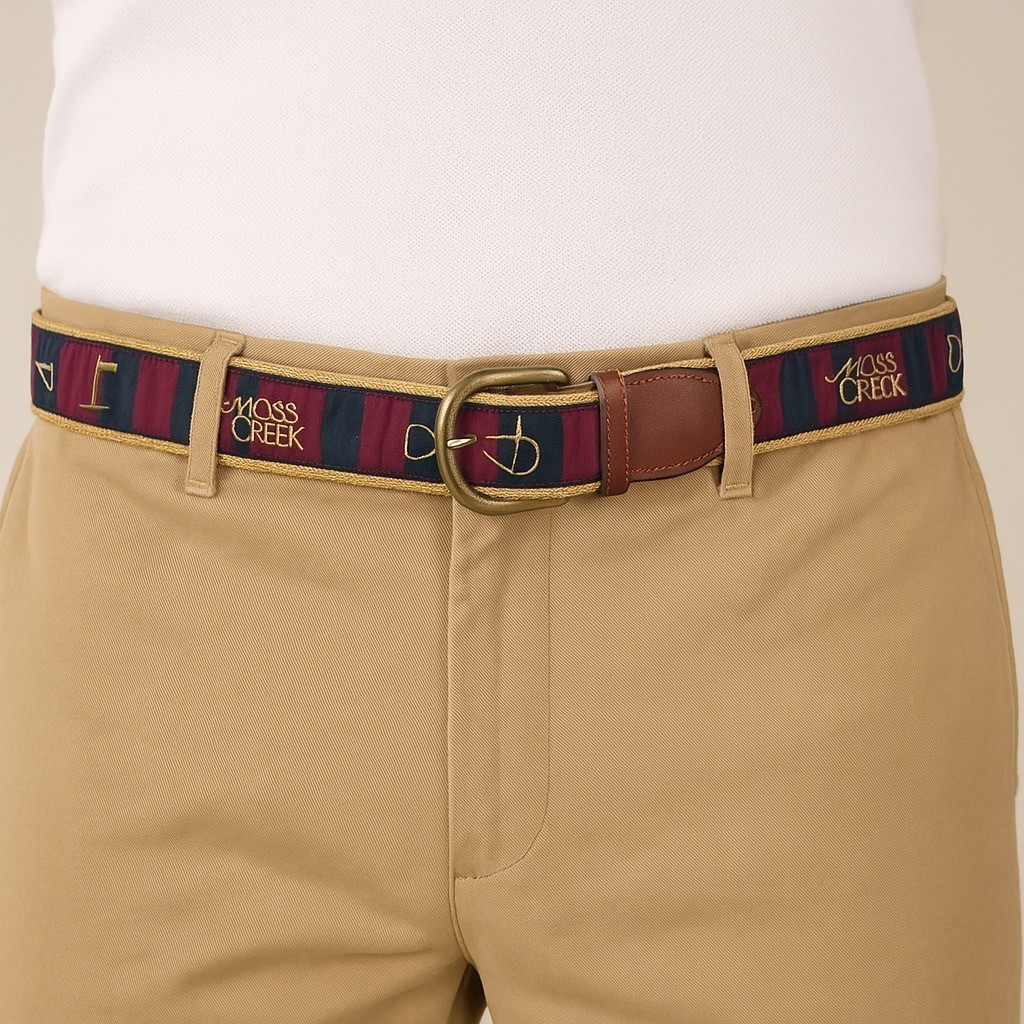 Classic Moss Creek golf-themed ribbon belt featuring maroon and navy striped grosgrain ribbon over a beige woven canvas base. Finished with genuine leather ends and a sturdy brass buckle. Made by Leather Man Ltd. in Exeter, New Hampshire. A timeless preppy accessory ideal for casual, golf, or resort wear.