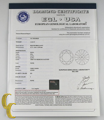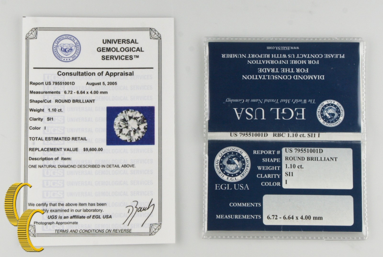 Features 1.1 carat Round Brilliant Center Stone Certified by EGL