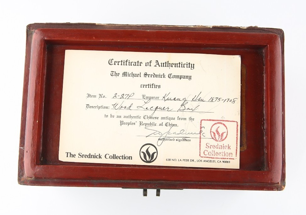 Antique Chinese Red Gold Lacquer Wooden Box Hand-Painted Qing Dynasty w/ CoA Gorgeous Hand-Painted/Inked Red Gold with Black Outlines Chinese Wooden Box Includes Original Interior Tray Includes Certificate of Authenticity from The Srednick Collection From the Reign of Emperor Kueng Hsu (1875-1908) (The Penultimate Emperor of China) Guaranteed Authentic Antique from Qing Dynasty Dimensions: 10" Wide, 6 1/4" Deep, 7" Tall Total Mass = 926.2 grams Beautiful Antique Piece from Imperial China! Local Pick-up is available in our showroom. (Contact us for payment methods to pay on pickup.) California Buyers: 9% sales tax will be added. Returns Policy: About Us: Continental Coin and Jewelry Company Web Department: Monday - Friday, from 10:30am - 6pm PST Reference Item #A08111401C JP