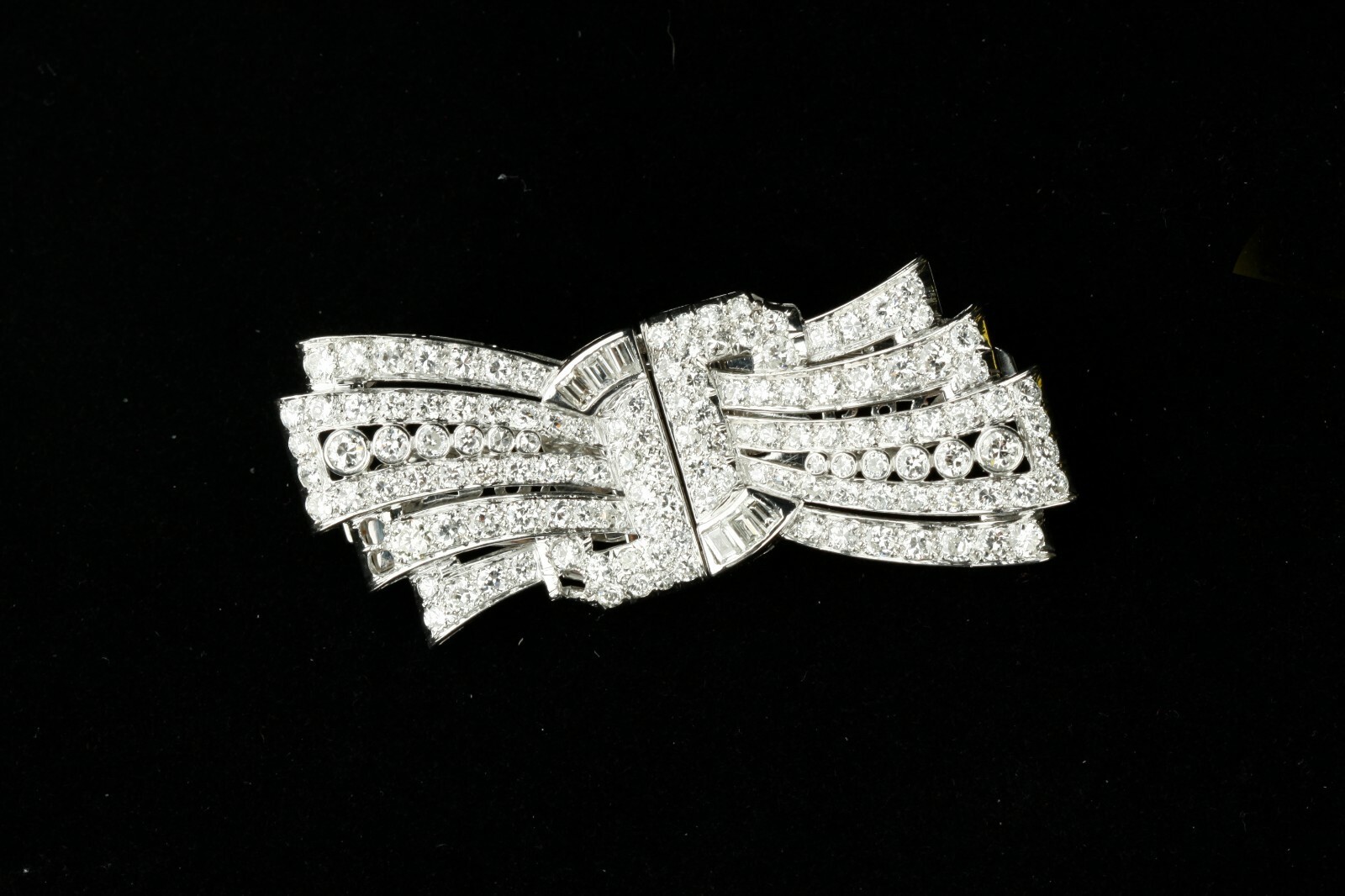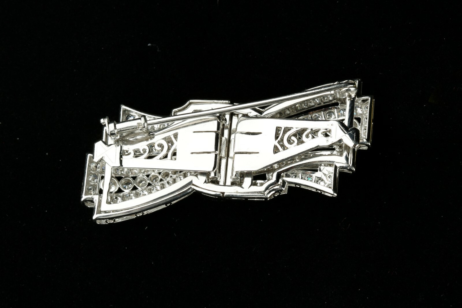 One electronically tested Platinum and 18KT white gold ladies custom cast assembled diamond double-clip/brooch.