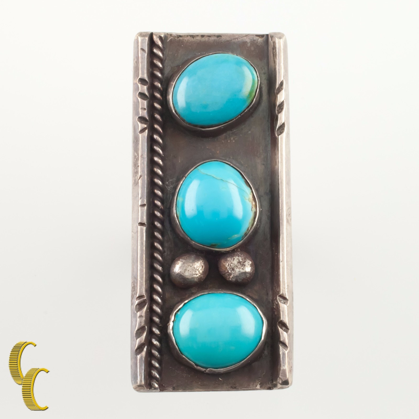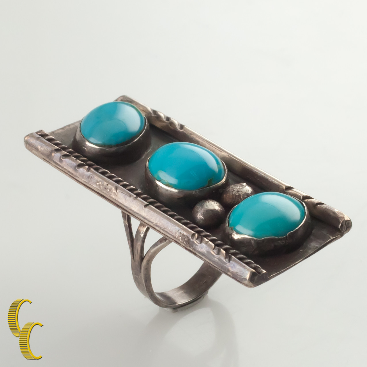 Silver Three Turquoise Plaque Ring Size 6.5 Nice Patina! Great Gift