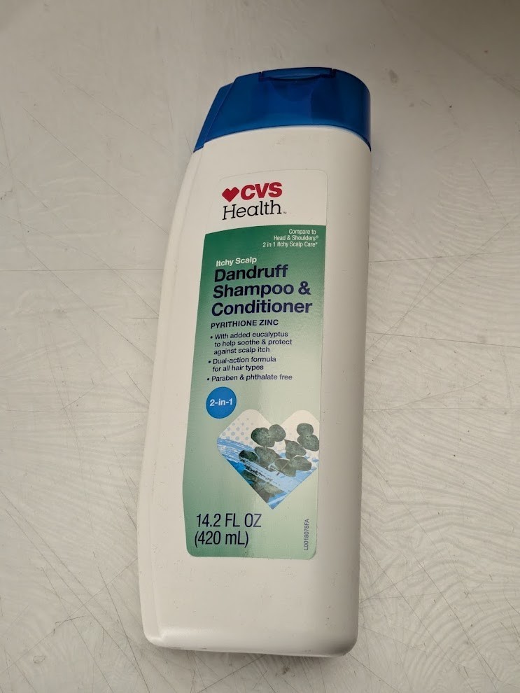 2 in 1 itchy scalp care Dual-action formula is suitable for all hair types Paraben and phthalate free Added eucalyptus helps to soothe and protect against scalp itch Get soft, shiny hair and relief from an itchy scalp with CVS Health Itchy Scalp Dandruff Shampoo and Conditioner. This unique, two-in-one-formula allows you to wash and condition your hair all in one easy step. Added eucalyptus soothes your scalp and keeps it protected from itching and irritation. The paraben and phthalate-free formula won't damage your hair and is free from irritants and allergens. Use it on any hair type from oily to dry, color-treated hair, and more. With regular use, you can help fight itchy, dry scalp and daily irritation. The shampoo can also help to reduce oiliness, prevent flakes, and calm any symptoms of itching. You'll get shiny, manageable hair along with excellent dandruff control so you can feel totally confident every day. Before you wash your hair, shake the shampoo bottle thoroughly to ensure all ingredients are mixed properly. Wet your hair first and make sure you fully lather it and massage it into your scalp and rinse with lukewarm water. Depending on the severity of your dandruff or your scalp itchiness, you can use this shampoo and conditioner daily. If your symptoms are milder, continue to use it at least twice per week for best results. If you're still coping with severe scalp problems, consult your doctor. You may need a stronger prescribed scalp treatment or shampoo. Directions Shake well before using. For maximum dandruff control, use it every time you shampoo. Wet hair, massage onto scalp, rinse and repeat if desired. For best results use at least twice a week or as directed by a doctor. Warnings For external use only. Do not get into eyes. If contact occurs, rinse eyes thoroughly with water. Stop use and ask a doctor if the condition worsens or does not improve after regular use as directed. Keep out of reach of children. If swallowed, get medical help or contact a Poison Control Center right away