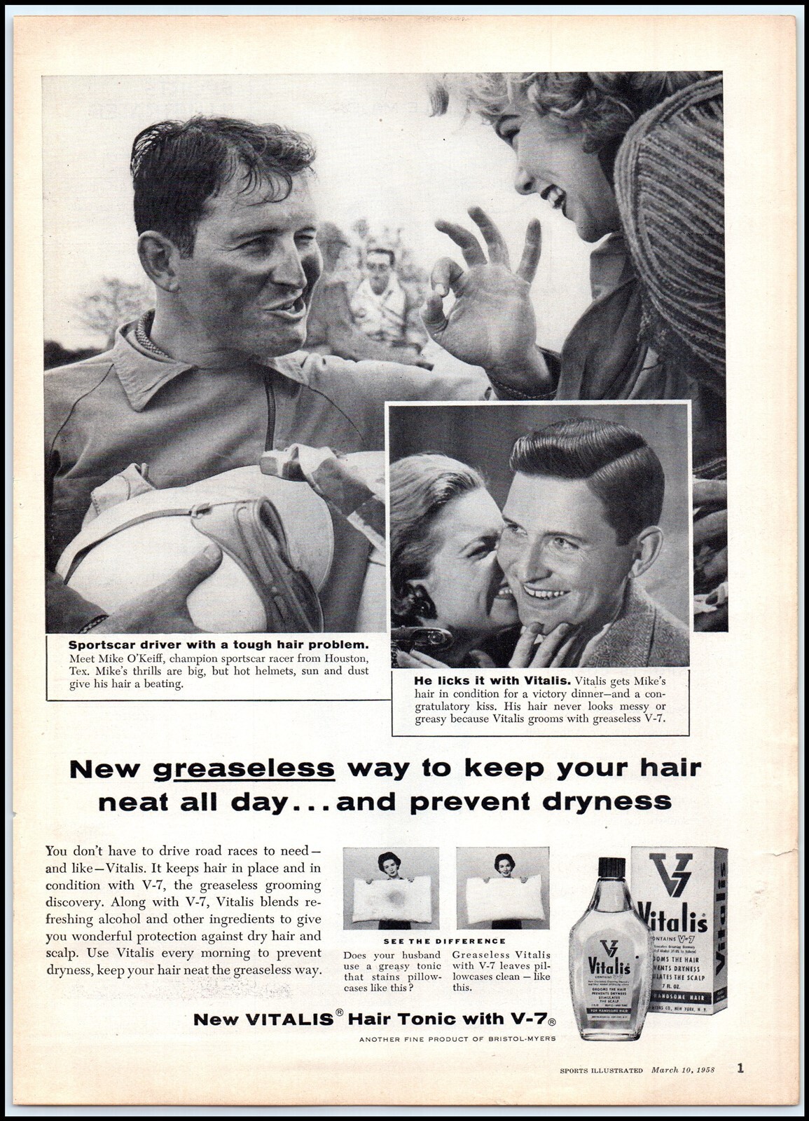 1950s Vitalis Hair Tonic with V-7 PRINT AD Sportscar Driver Mike Okeiff BX3
