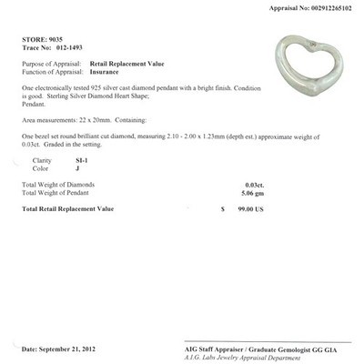 DIAMOND WEIGHT: 0.03 CT. COLOR: J CLARITY: SI1 *APPRAISAL CERTIFICATE IS NOT INCLUDED *Condition descriptions are approximate. Please see photos for the actual item you are bidding on. All shipments include insurance and delivery confirmation or signature confirmation. Local Pick-up is available in our showroom. *The customs requirements for each country, including all import duties, taxes, and fees are the responsibility of the buyer. All international packages will have the required customs declaration and value of order. 9% sales tax will be added. We offer a 30 day money back return policy. If you are unhappy with your purchase for any reason, please notify us so that we can begin the returns process. Thank you. Continental Coin and Jewelry Company Web Department: Monday ? Friday,