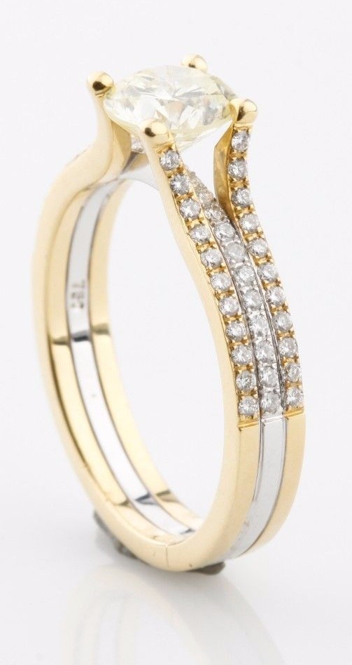 18k Yellow White Gold Pave Set 3 Band Round Brilliant Diamond Solitaire Engagement Ring