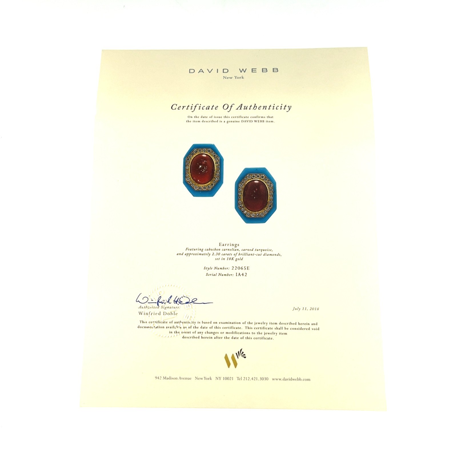 David Webb 18k Gold Turquoise, Carnelian, and Diamond Earrings w/ CoA