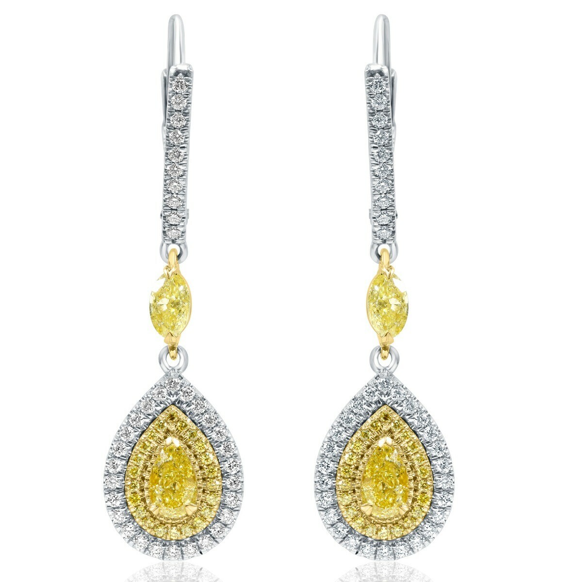 Facture a la main dans l'or bicolore 14K, ces boucles d'oreilles comportent des diamants jaunes de fantaisie naturel de 0,88 carat coupes dans un double halo de diamants rond jaunes et incolores en pave, attache a la fermeture de levier par 0,62 carat ovale de diamants jaunes de fantaisie. Ces magnifiques boucles d'oreilles offrent une lueur et brillance spectaculaires !! Le poids total des carats est de 2,42 carats.