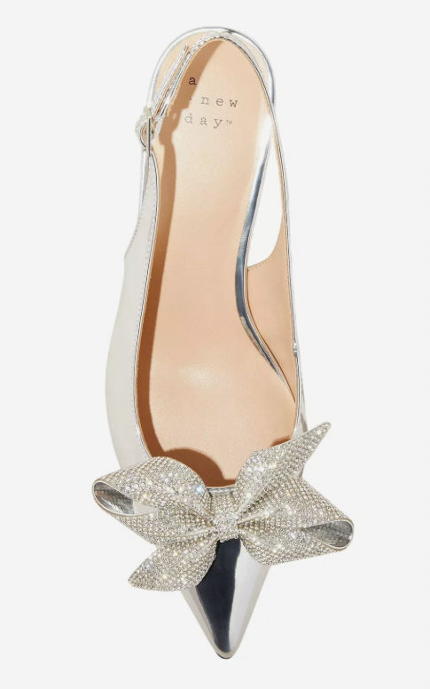 Step out in glam style wearing these Priscilla Bow Slingback Kitten Heels from A New Day. These silver heels feature a closed pointed-toe vamp adorned with a voluminous 3D bow embellished with sparkly glass beads for a standout look. Set on a two-inch Louis heel, the sandals boast a cushioned insole and comfy lining, adding height while allowing for comfortable walking. Plus, they have an airy slingback silhouette with a sleek strap and adjustable buckle closure.
