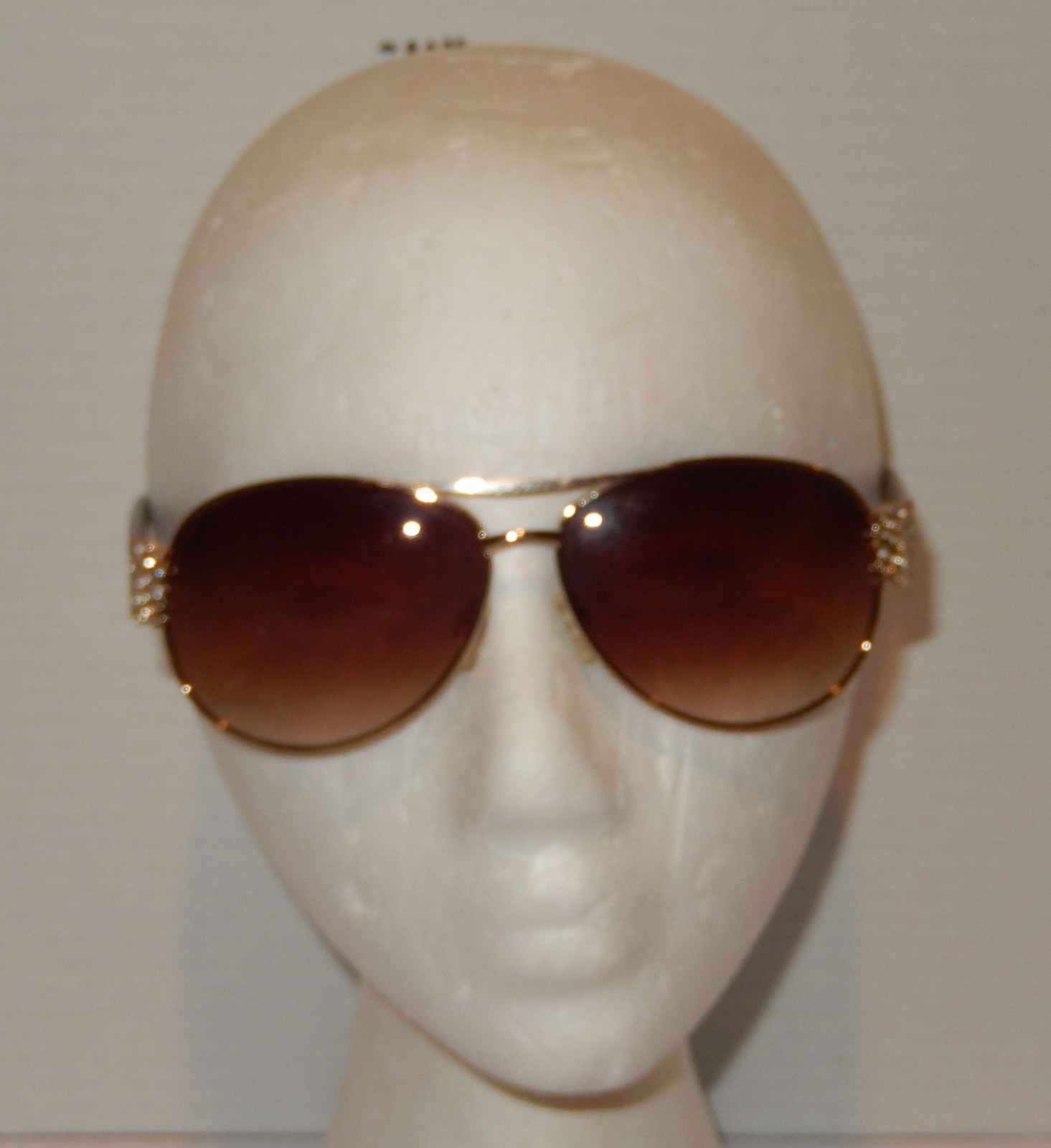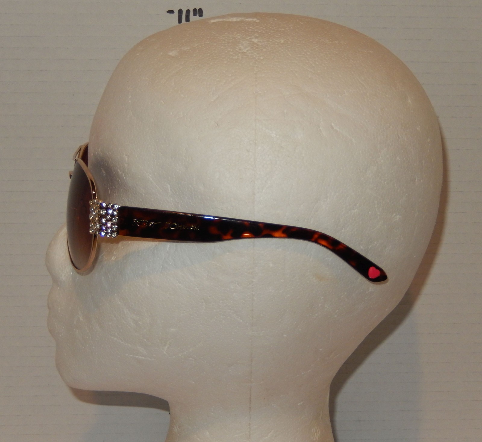 Add a touch of glam to your look with these Betsey Johnson aviator-style sunglasses. Featuring a chic tortoiseshell frame with gold detailing and sparkling rhinestone accents on the temples, these shades blend bold style with timeless elegance. The brown gradient lenses provide comfortable eye protection while complementing the warm tones of the frame. Perfect for adding designer flair to any outfit!
