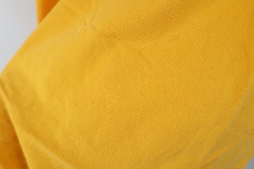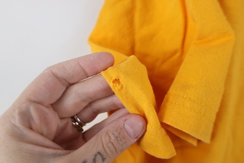 Stains front. Holes front, right arm. Graphics, color faded. Collar, arms discolored. Pilling