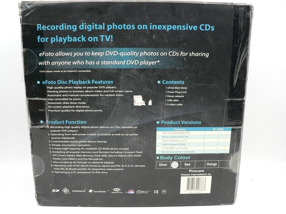 This eFoto Photo CD Recorder is a top-of-the-line device that allows you to easily record your favorite memories. With its advanced features and high-quality performance, this recorder is perfect for anyone who wants to capture life's precious moments. Made by Procare Technology Corporation, this recorder is a reliable and durable choice for all your recording needs.