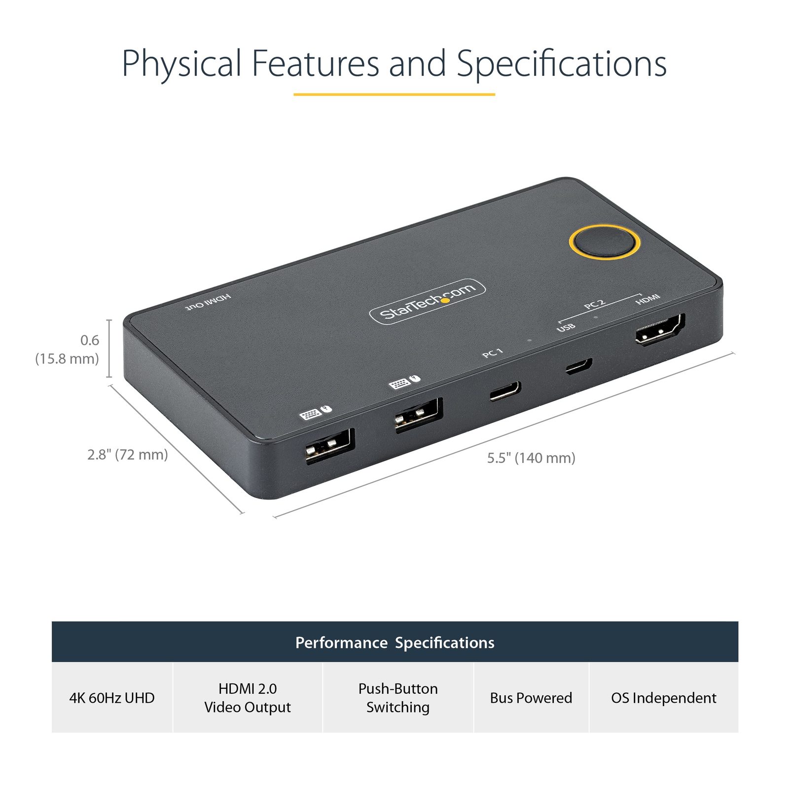 StarTech.com 2 Port Hybrid USB-A + HDMI & USB-C KVM Switch - Single 4K 60Hz HDMI