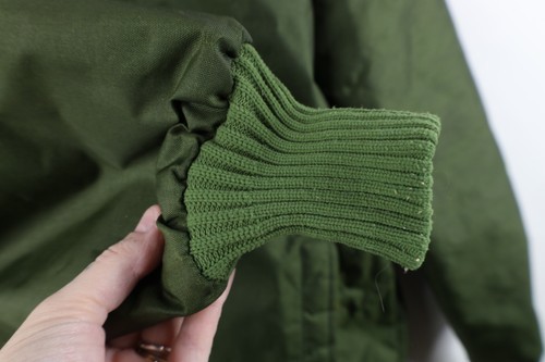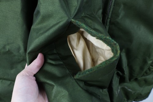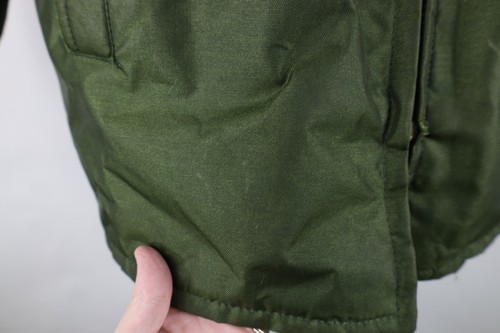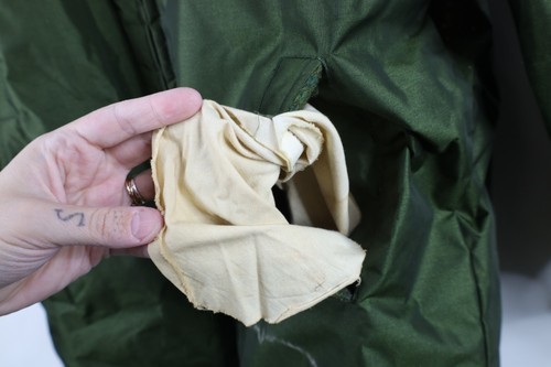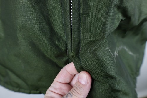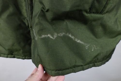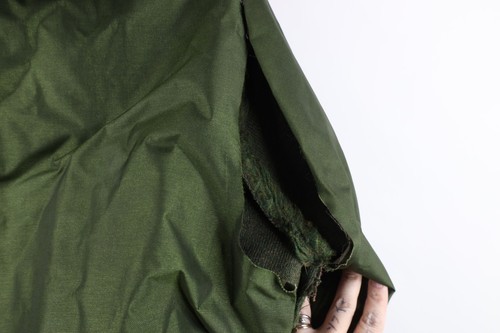 Reversible. Hole in left pocket lining. Shiny side: Blemishes on bottom. Tear in right shoulder seam. Blemishes and fraying on left cuff/sleeve. Pilling on cuffs. USA made