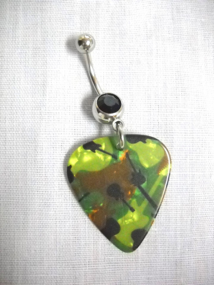 14 guage stainless steel navel ring with a GREEN ARMY CAMO BLACK FLOATING ELECTRIC GUITARS PRINTED GUITAR PICK on a BLACK CUBIC ZIRCONIA STONE banana bar