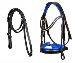 Challenger horse size all-purpose English bridle crafted from vegetable-tanned soft yet supple black leather. Bridle comes accented with a eye-catching browband with a row of large clear rhinestones. The perfect choice for training, or everyday use. Soft blue leather padded cushioning provides comfort. Features non-rust stainless steel hardware. Comes complete with buckle end laced reins.