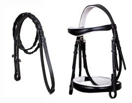 Challenger horse size all-purpose English bridle crafted from vegetable-tanned soft yet supple black leather. Perfect choice bridle for training, or everyday use. Soft white leather padded cushioning provides comfort. Features non-rust stainless steel hardware. Comes complete with buckle end laced reins.