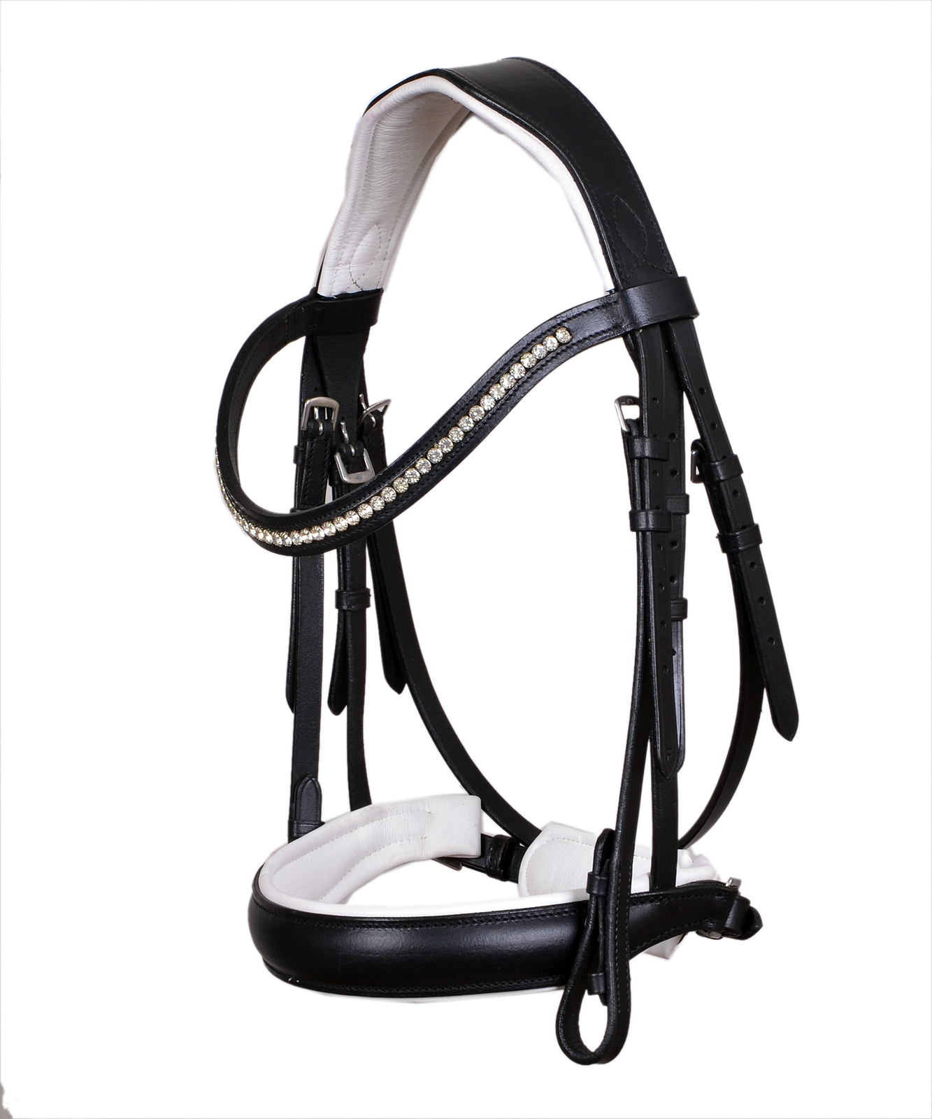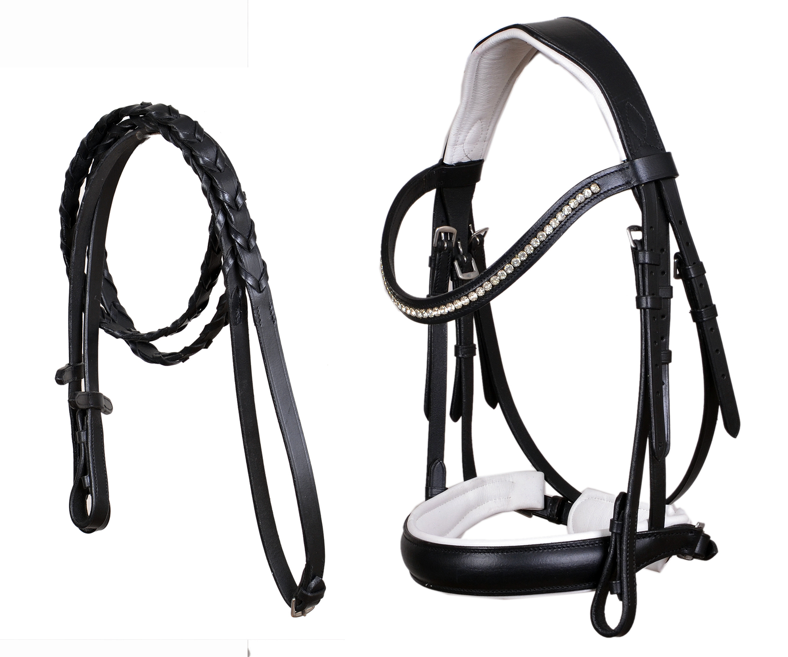 Challenger horse size all-purpose English bridle crafted from vegetable-tanned soft yet supple black leather. Bridle comes accented with a eye-catching browband with a row of large clear rhinestones. The perfect choice for training, or everyday use. Soft white leather padded cushioning provides comfort. Features non-rust stainless steel hardware. Comes complete with buckle end laced reins.