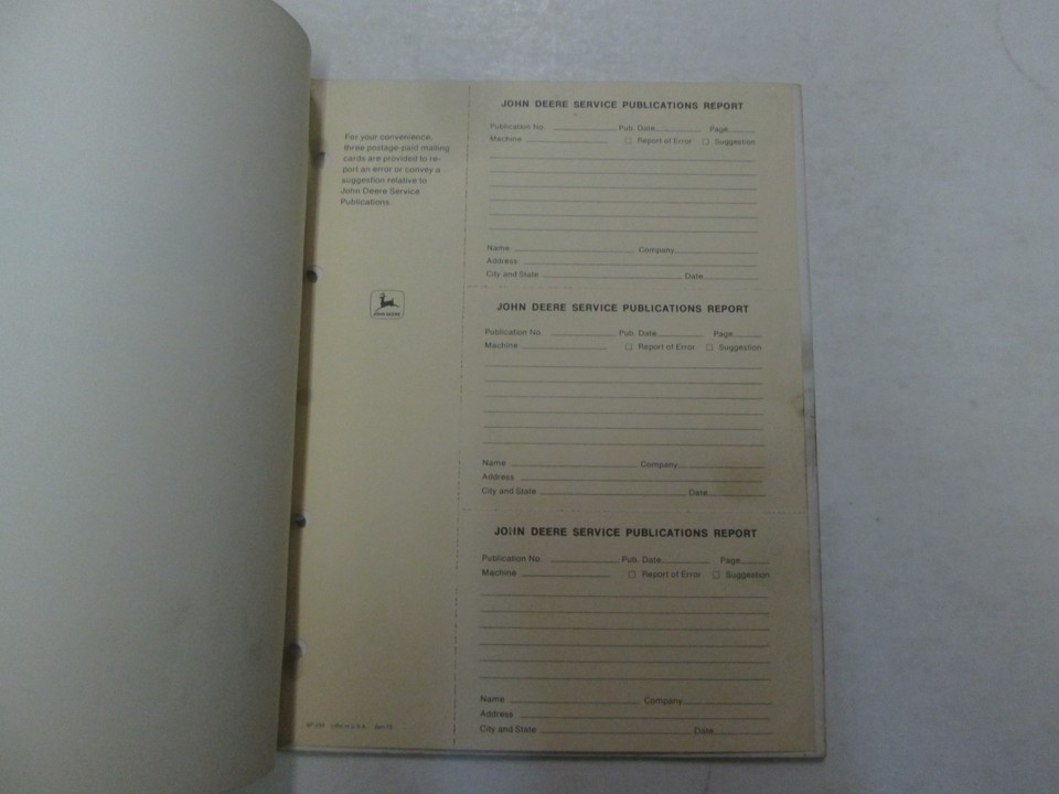 Technical manual has minor stains on the front cover along with the back. Over all the contents within are in good legible condition. Loads of information and illustrations, COVERS A LOT, exploded illustrations and/or diagrams, great manual to have when you own A JOHN DEERE. We will leave POSITIVE Feedback after we receive your payment. Please do not forget to give us POSITIVE Feedback and FIVE Stars on all of the Detailed Seller Ratings! If you are not satisfied with your shopping Experience, please contact us to get a solution before you decide to leave a NEUTRAL or a NEGATIVE Feedback, We will do our best to solve any problems for you as soon as possible. We will provide you with the BEST POSSIBLE service because the POSITIVE Feedback and FIVE Stars are what we are striving for. Please